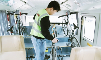 机场大巴拆后排变身骑行保障车