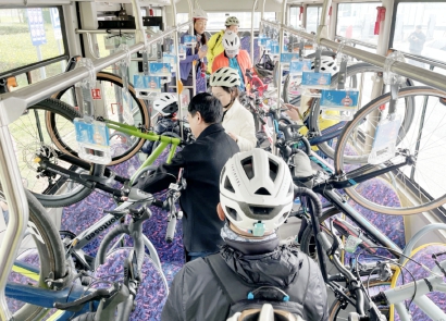 2024年年底推出的“顺骑自然”单车巴士东滩专线,就将公交车改造成保障车,装载自行车随骑行团队移动。
