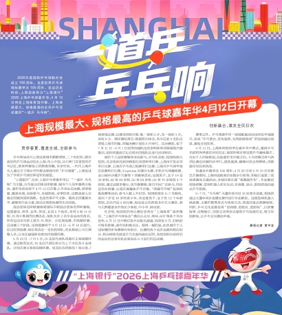 2026年是国际乒乓球联合会成立100周年,也是世界乒乓球锦标赛举办100周年。在这历史时刻,上海创新举办“上海银行”2026上海乒乓球嘉年华,4月12日将在上海体育馆开幕。上海规模最大、规格最高的全民乒乓活动邀你“一道乒 乓乓响”。