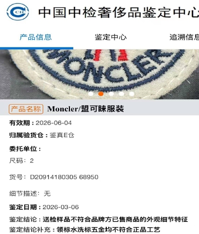 2026年3月6日,鉴定机构出具报告,两件送检羽绒服的鉴定结论一致:“送检样品不符合品牌方已售商品的外观细节特征,领标、水洗标、五金均不符合正品工艺。”