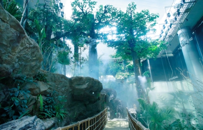 记者探访该展区,体验下来的感受是,好玩,在“山体”“雨林”“浓雾”之间穿梭,“雨林秘境”名副其实。“魅力雨林”区域会每2小时一次、每次10分钟喷洒水汽,模仿真实的雨林高湿度环境,还能拍到美丽的丁达尔现象,想要有探险感的不要错过。但最好带好帽子,注意安全,路面湿滑,还做了模仿岩石、吊桥等设计,小朋友们不要乱跑。