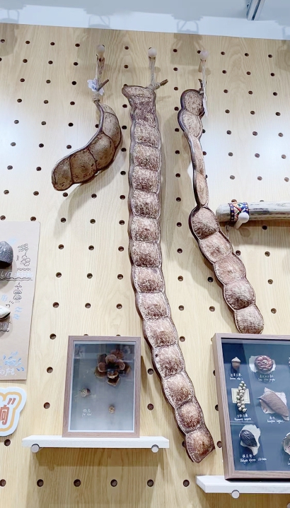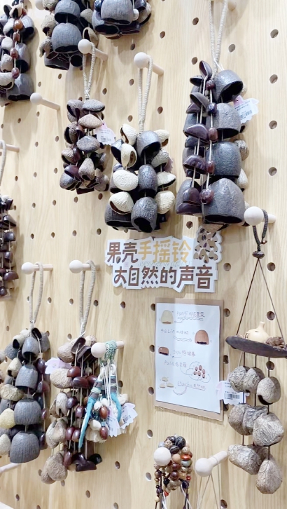 店内的仙人掌雨棍堪称解压神器。店长杨杰将仙人掌雨棍缓慢转动,只听内部种子果实滑动,发出潺潺水声,如同置身森林溪流,温柔驱散焦虑与压力。一旁的“疗愈墙”挂满果壳手摇铃,天然果壳串联而成,摇晃时流淌出微风簌簌、溪水叮咚的自然白噪音。“这些都是纯手工制作,让每一串纹理、音色都独一无二,是午休、睡前助眠的绝佳伴侣。”杨杰介绍,这类声音疗愈产品备受上班族青睐,试运营期间销量持续走高。记者注意到,为了方便顾客辨识这些奇奇怪怪的种子,墙上还特地手绘了科普图。