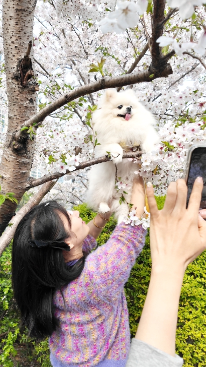 除了长枪短炮的摄影爱好者,步道上还不乏带着萌宠悠闲散步的市民。家住青浦的钱先生牵着两条狗狗,正惬意地享受着柔和的春风。“今天刚好来商场取东西、吃个饭,走到室外发现河边特别热闹。”他告诉记者,“这边不仅樱花开得漂亮,微风吹着也很凉爽,带狗狗沿河逛一圈感觉非常放松。”