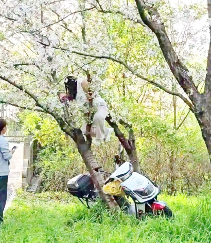 视频中,一辆电瓶车停在樱花树下,一位女游客正在往树上爬,推断她可能是先踩在电瓶车上,然后才能上树。另外一名女游客给她递手机时,樱花树倒了下去。