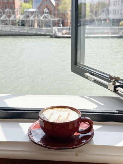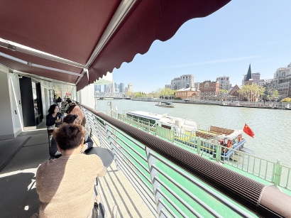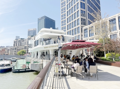当然,市民游客们的打卡热情也可以理解。这艘奶白色船形建筑依河而建,线条流畅的船身与碧波荡漾的河面交相呼应,在蓝天白云的映衬下更显柔和雅致。登上二楼甲板,抬眼便能望见上海大厦和陆家嘴三件套同框的壮阔天际线,随手一拍便是兼具历史韵味与都市繁华的世纪同框;而临河的窗前则能看到对面外滩源的历史建筑,坐下点一杯咖啡便能体验网友口中的“沪版塞纳河畔”。记者在现场采访的三个多小时里,这两处核心打卡点持续爆满,想要在最佳位置拍摄一张打卡照往往需要长时间等候,足见其火爆程度。