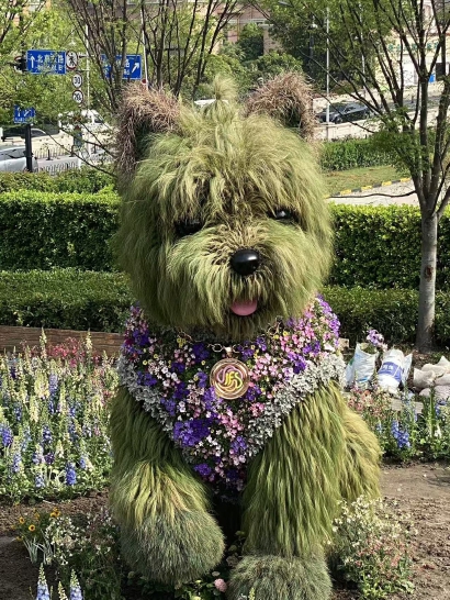 “毛绒绒小狗”其实是即将开幕的上海国际花卉节静安分会场的一个景点“花漾萌宠乐园”,“小狗”本身刚刚完工,但周围场景还没有全部布置好。可能是“小狗”做得太逼真、太萌了,有人从“小狗”旁边的天桥上“偷拍”了它,没想到在社交媒体走红了,于是,就有更多人来“偷拍”。