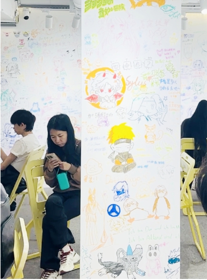 周一午后,10后女孩影愚正站在涂鸦墙前,手里捏着丙烯马克笔,聚精会神地写下自己喜爱角色的创作小片段。她不会画画,更爱写文。“线下能把自推的名字写上去,感觉特别开心。”她刚买了自推的特典徽章,趁没课跑来涂鸦,“和陌生人一起创作同一面墙,感觉很快乐很幸福。”